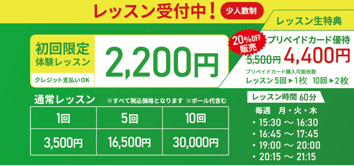 といった安心の環境でご参加いただける他、レッスン日以外の個人練習にご利用いただける「プリペイドカード」を20%OFF にてご購入いただける特典もご用意しております。