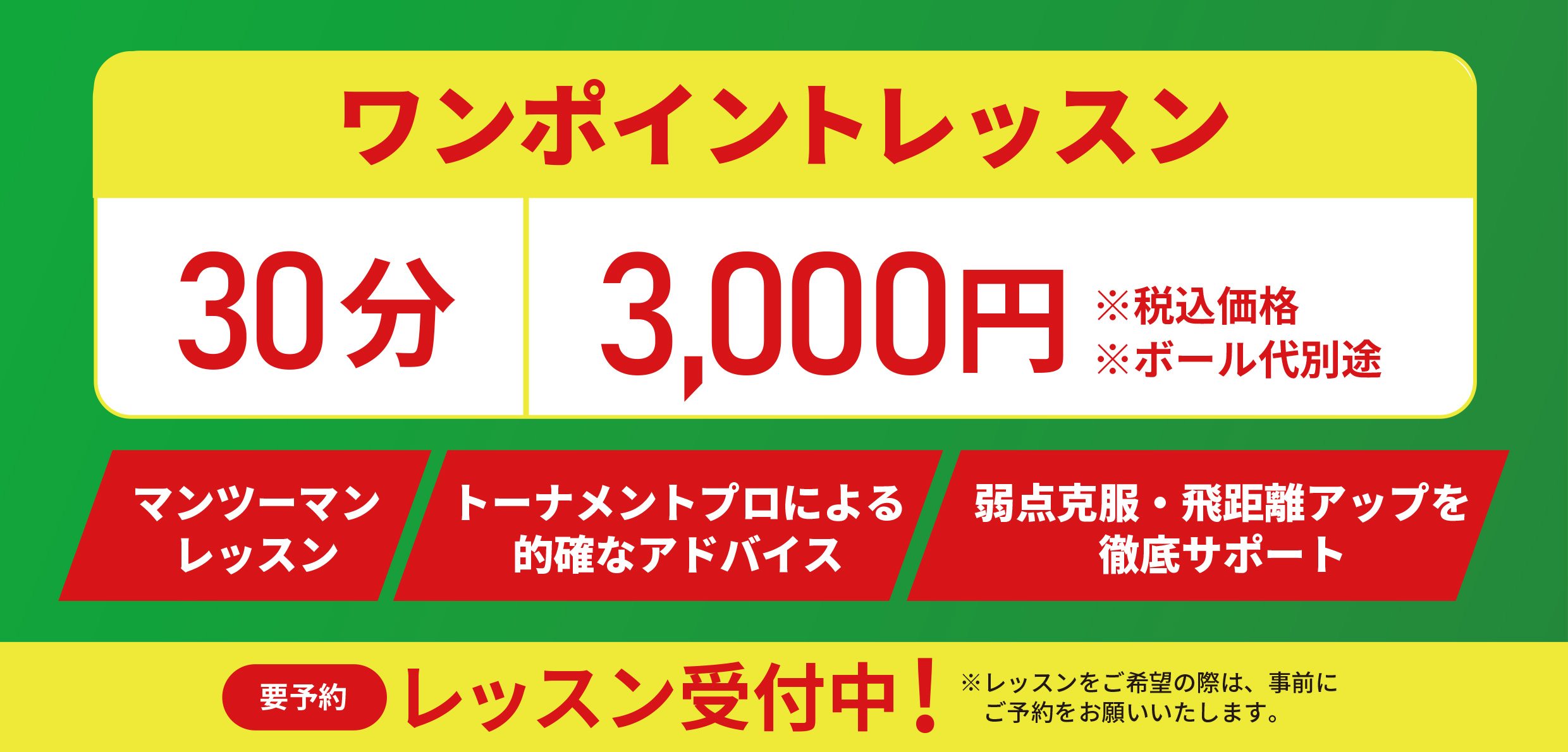 さらに、マンツーマンレッスンをご希望の方には、30分 3,000円(ボール代別途)にて個別指導のワンポイントレッスン(要予約)も承っております。